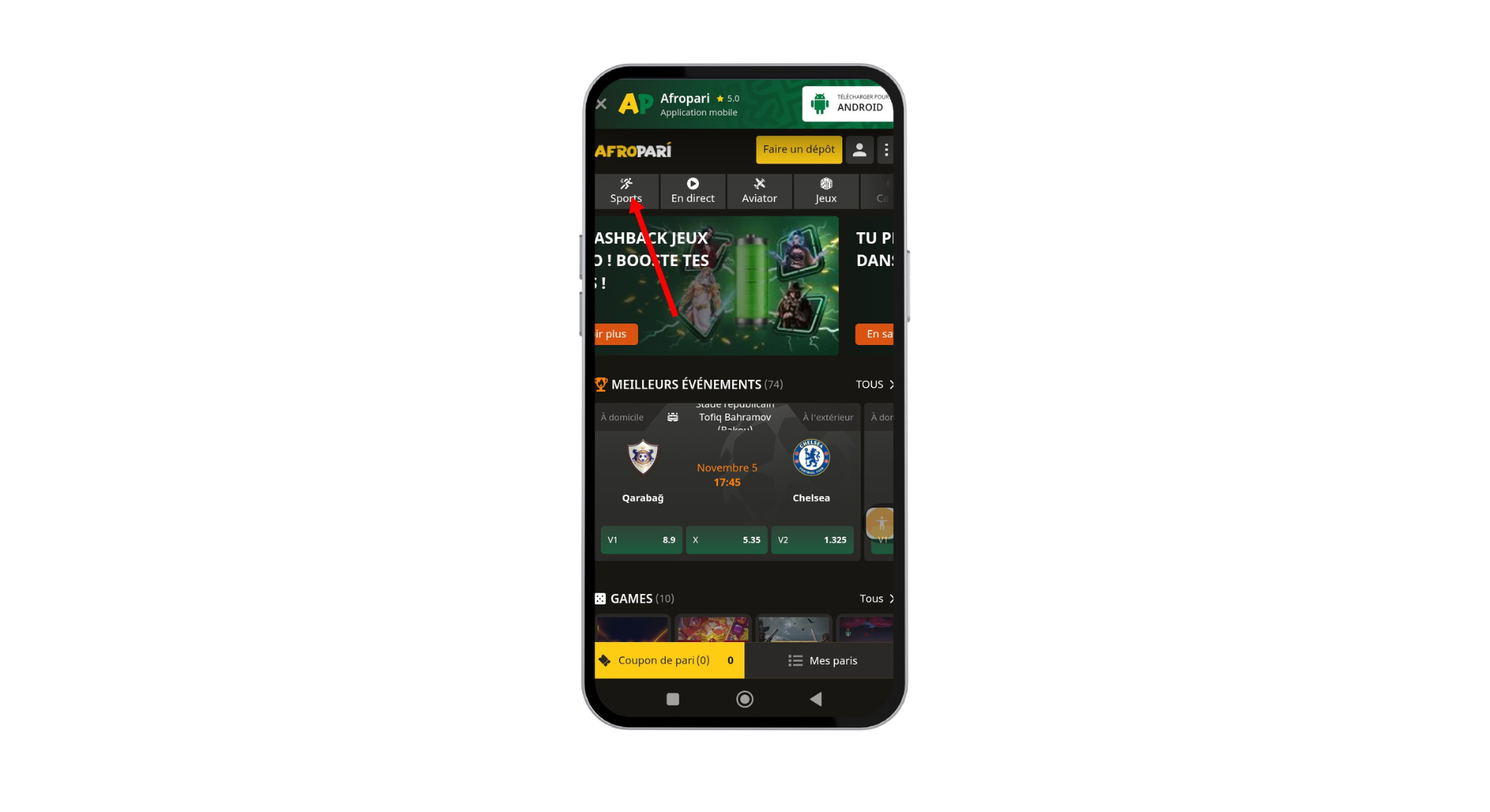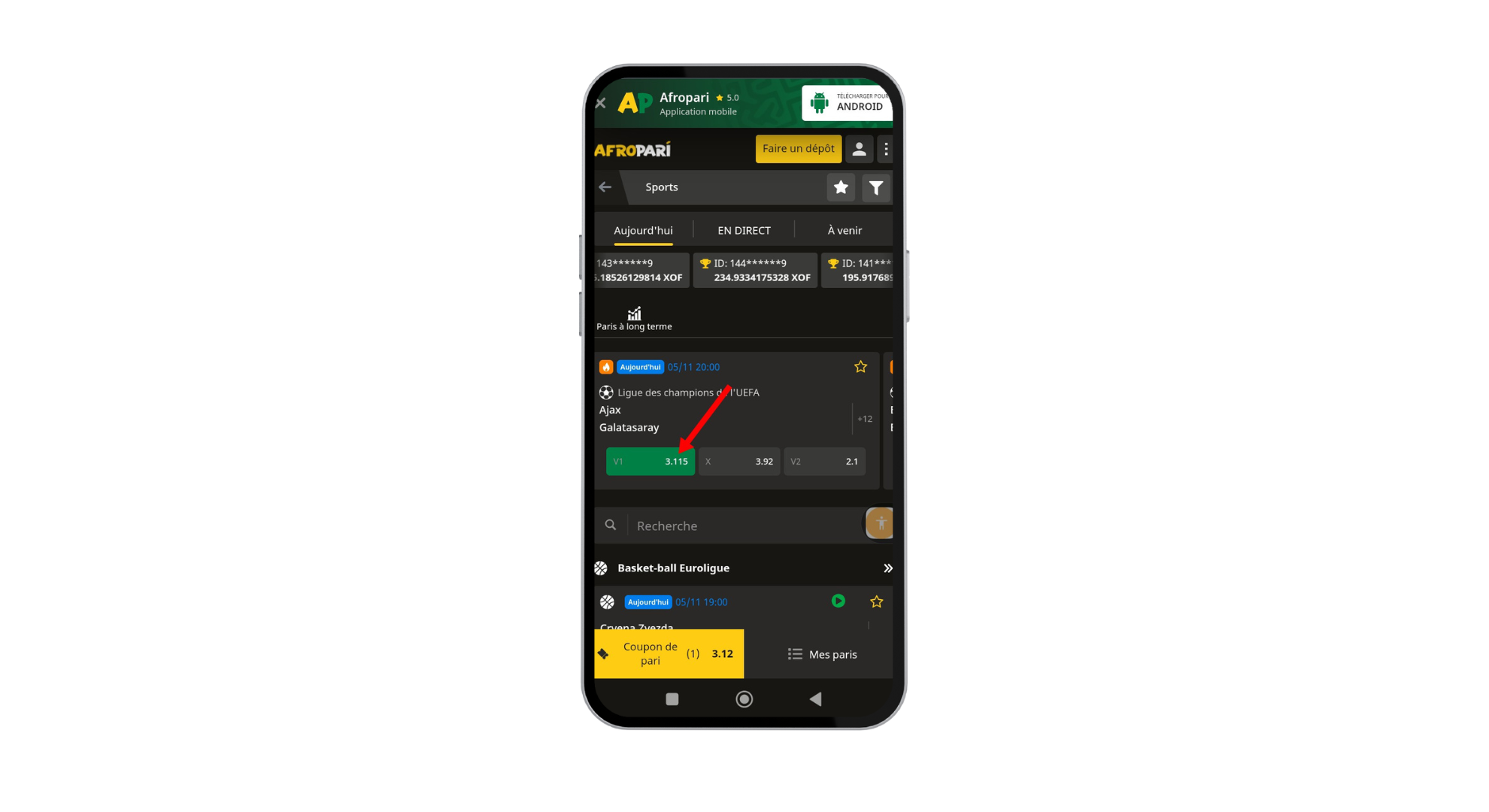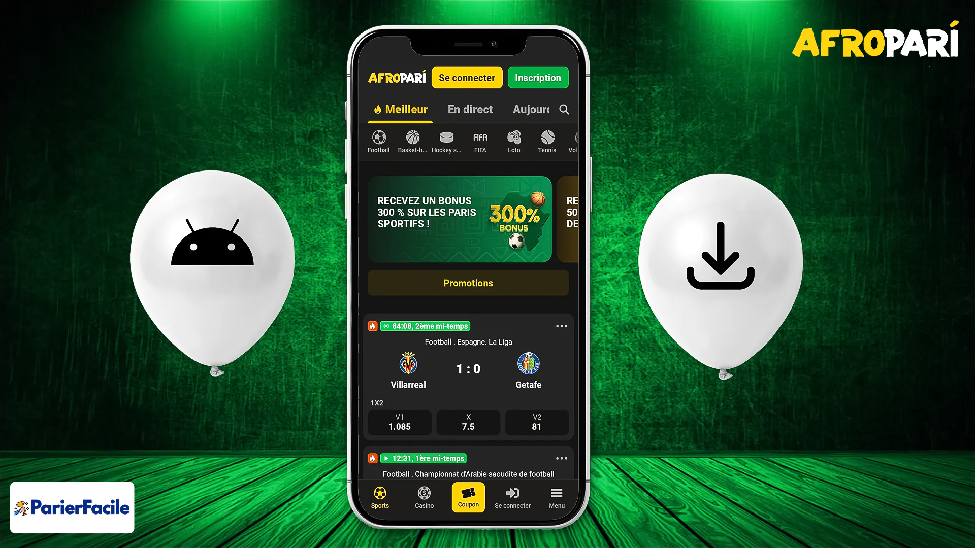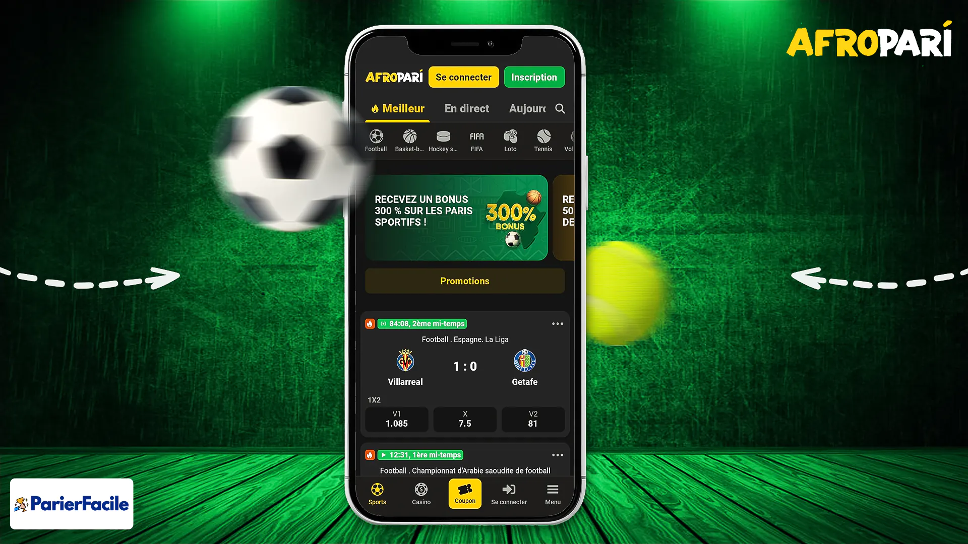 Saisissez votre code promo Afropari YYY et choisissez entre le bonus pour les paris sportifs ( 300%) et le bonus pour le casino ( 200%)