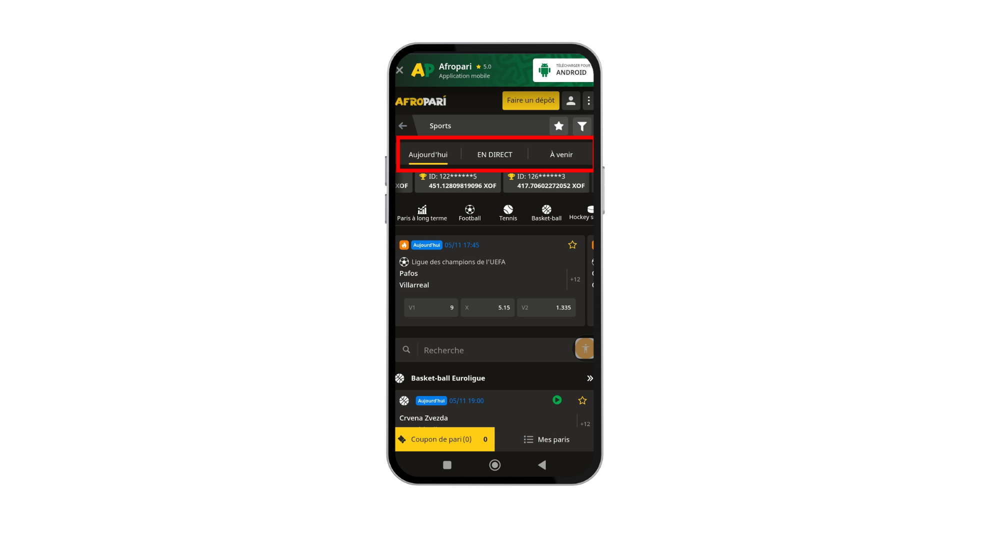 Choisissez entre les matchs du jour, les paris en direct ou les événements à venir selon vos préférences. Ici, sélectionnez “Aujourd’hui”.