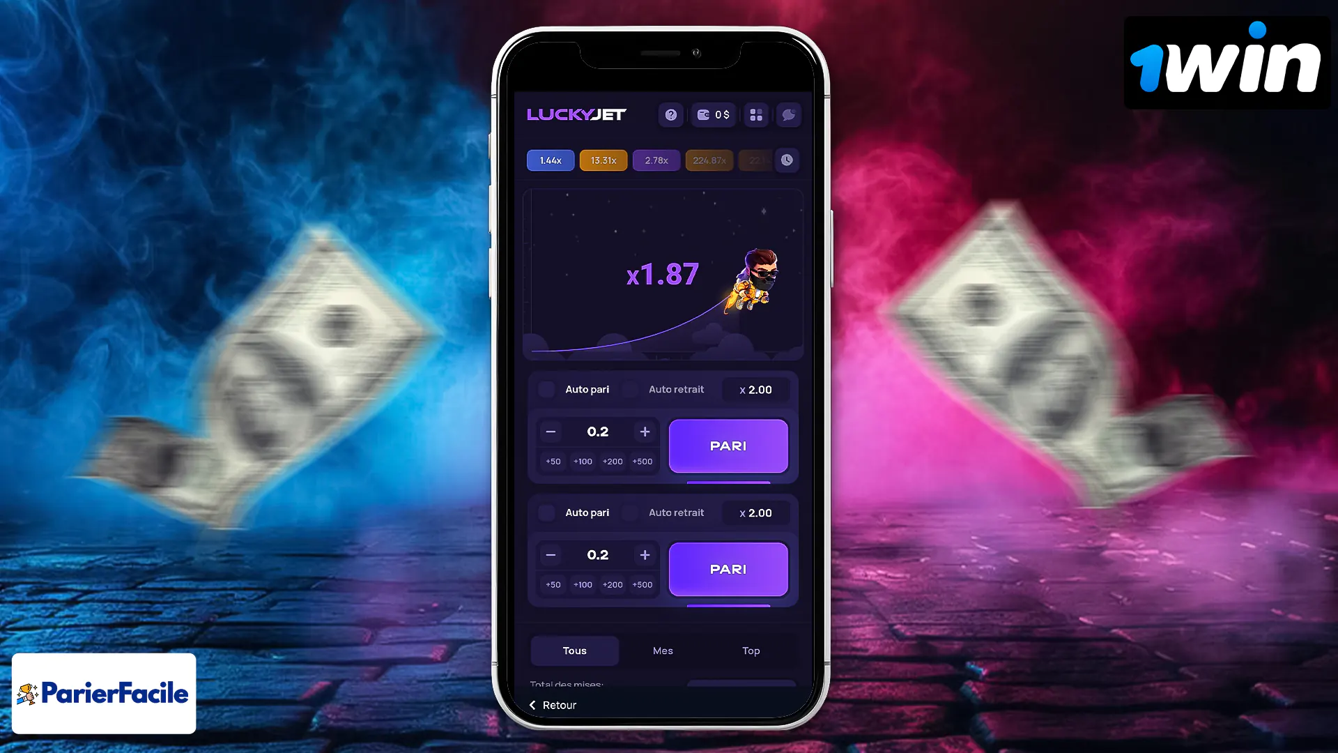 Les règles du jeu Lucky Jet : Lucky Jet est un jeu de type « Crash » exclusif au casino 1win, similaire à Aviator. Le principe est simple : le personnage « Lucky Joe » s’envole avec un jetpack et le coefficient multiplicateur augmente (de x1.0 à x100 ou plus). Le but du joueur est de placer une mise et de cliquer sur « RETRAIT » avant que Joe ne s’envole hors de l’écran. S’il retire à temps, la mise est multipliée par la cote affichée. Sinon, la mise est perdue. Le taux de redistribution (RTP) est de 97%.