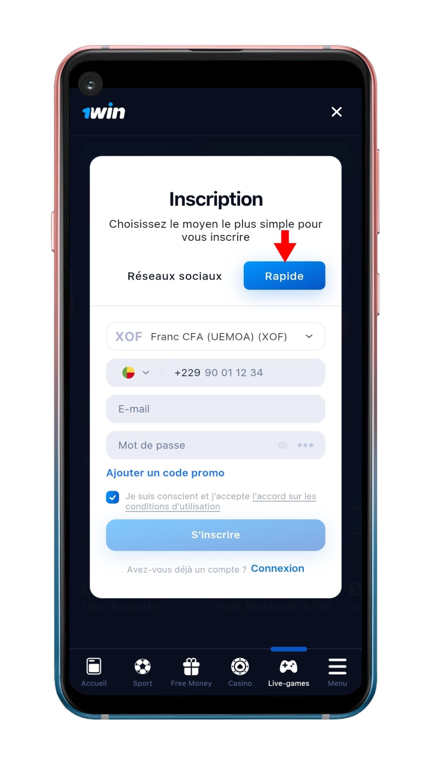 Lorsque vous avez eu recours à la version navigateur pour vous inscrire sur 1win Togo, servez-vous de nouveau du lien pour vous connecter. À l’extrême droit de votre écran, cliquez sur l’option « Connexion ».