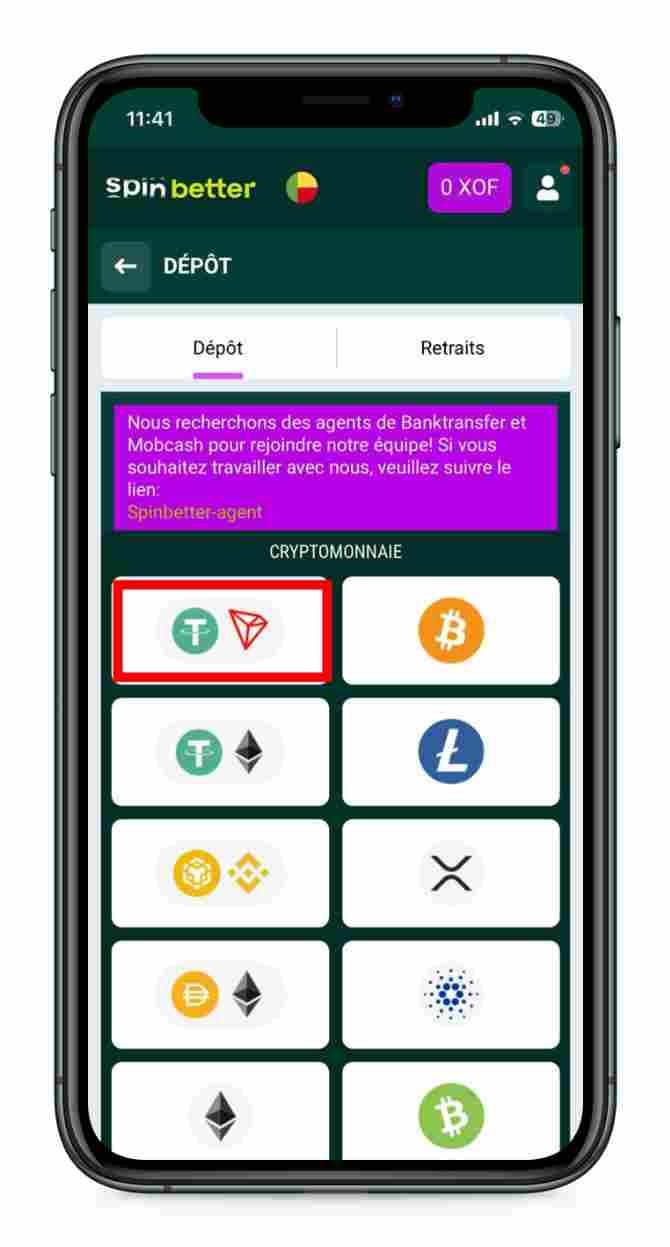 Entrez la somme que vous souhaitez verser. Notez que le dépôt minimum est généralement de 1 500 XOF (ou équivalent). Remplissez les champs requis (numéro de téléphone ou adresse de portefeuille).