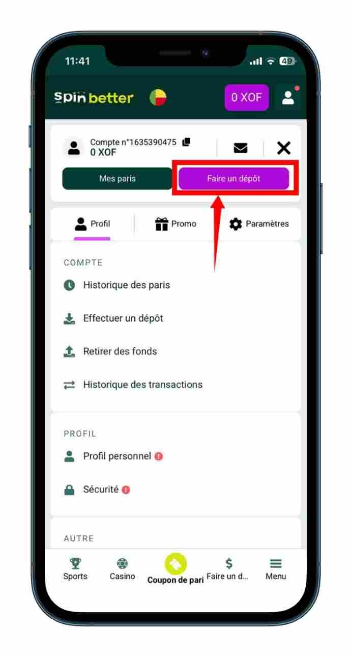 Une fois connecté à votre compte, cliquez sur le bouton « Faire un dépôt » situé en haut de l’interface (souvent représenté par une icône de portefeuille).