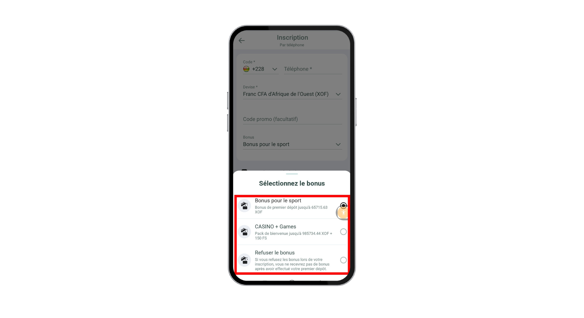 Sélectionnez le bonus paris sportifs, le bonus casino, ou cliquez sur “refuser le bonus” si vous souhaitez jouer sans offre promotionnelle.