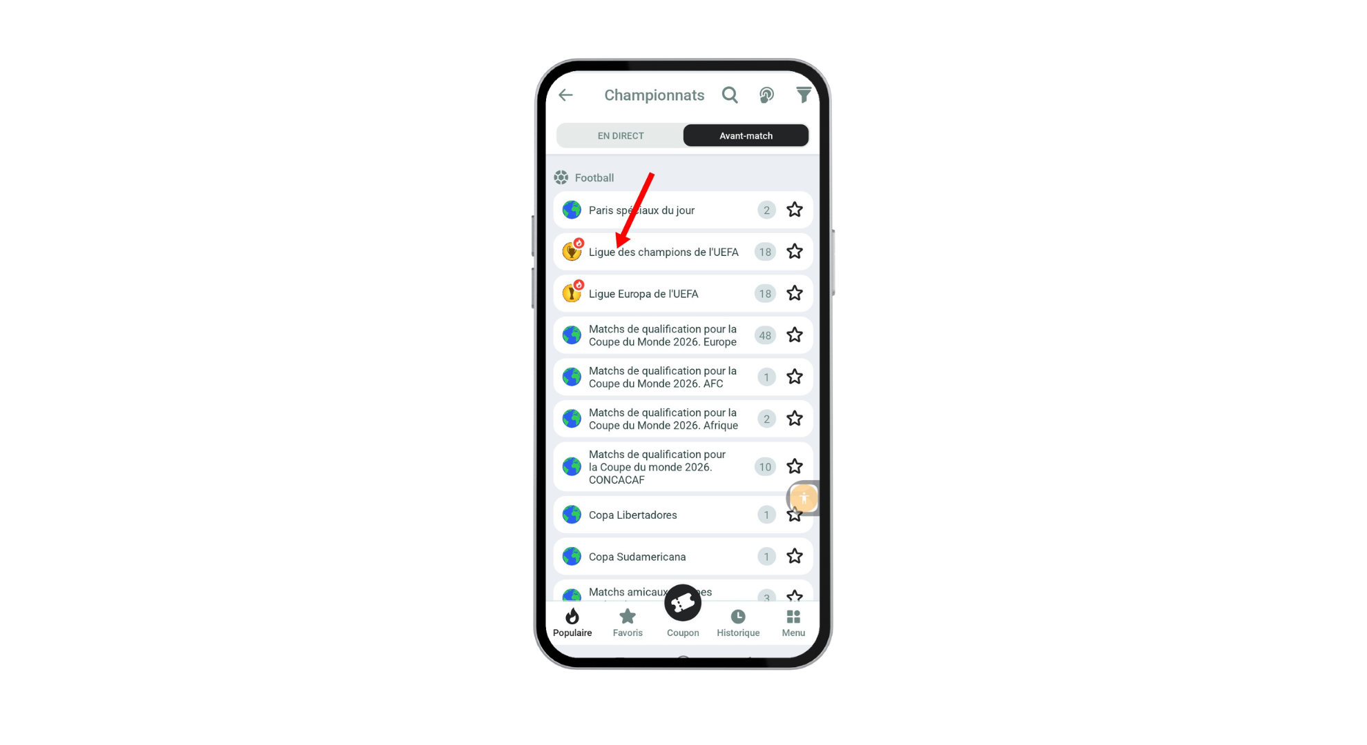 Parcourez la liste des compétitions disponibles et sélectionnez celle de votre choix, ici, nous avons choisi “la Ligue des Champions de l’UEFA”.