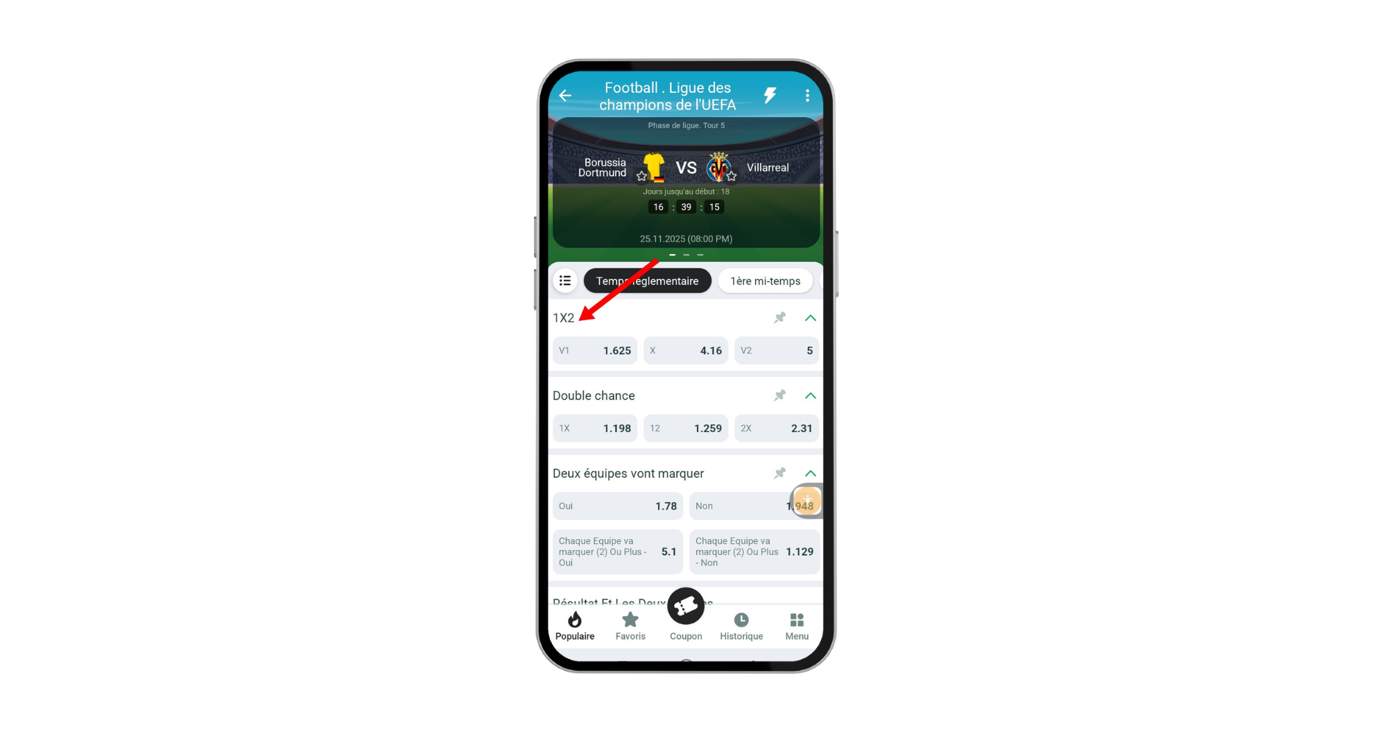 Sélectionnez le marché souhaité, ici le 1X2, pour prédire la victoire, le nul ou la défaite d’une équipe.