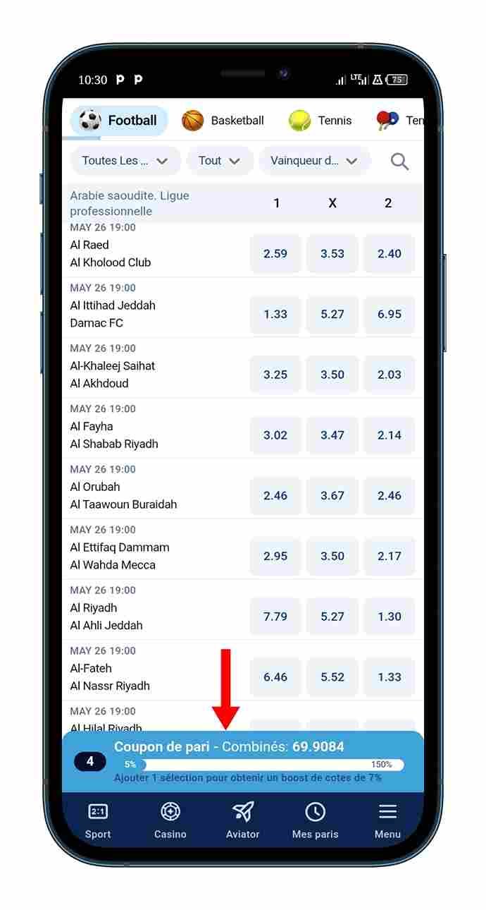 Cliquez sur le coupon de pari pour vérifier la sélection choisie, la cote totale et les détails du pari avant toute validation finale.