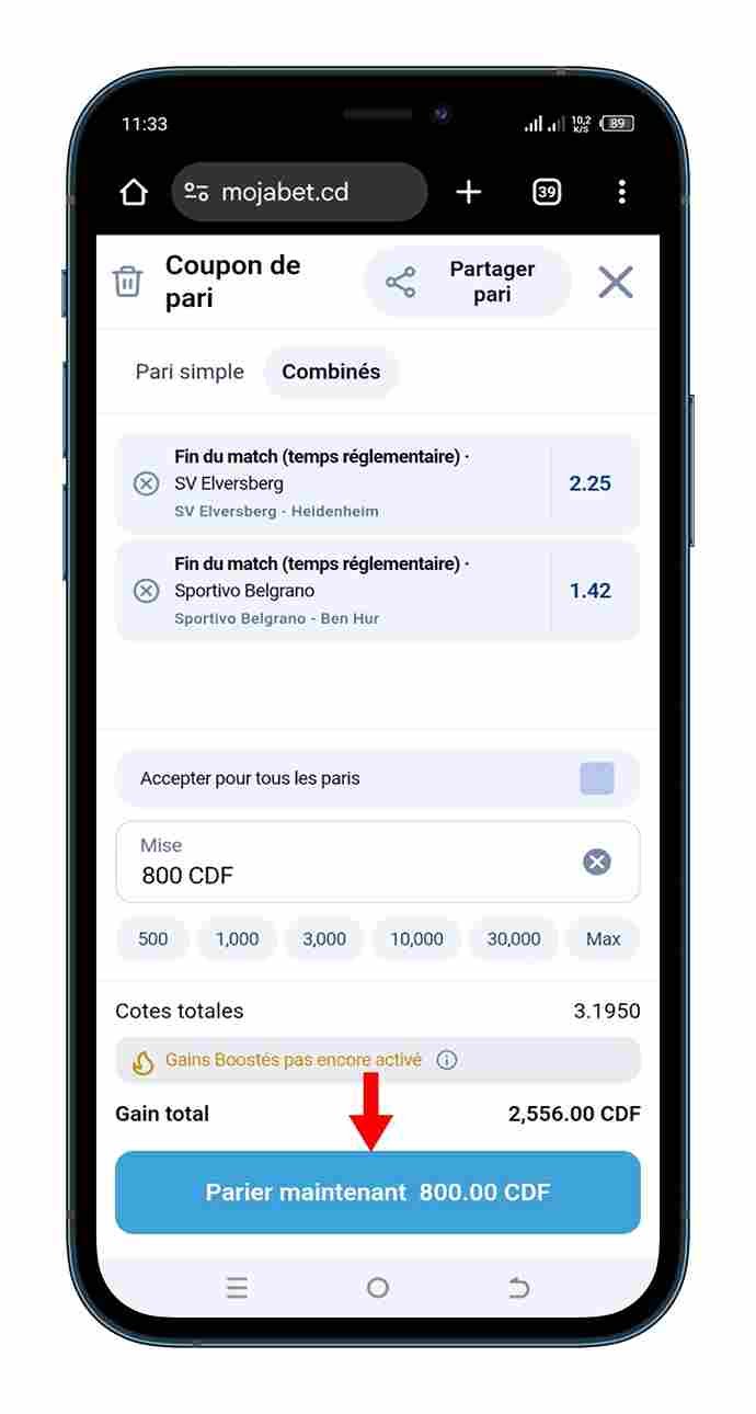 Entrez le montant à miser, vérifiez les gains potentiels affichés, puis confirmez le pari pour l’enregistrer officiellement sur votre Mojabet compte .