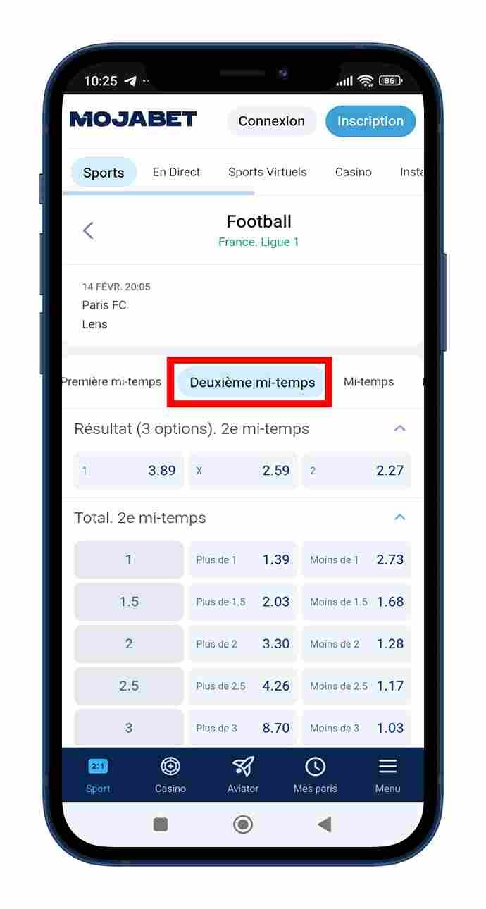 Étape 6 : Sélectionner le type de pari et la cote mojabet
