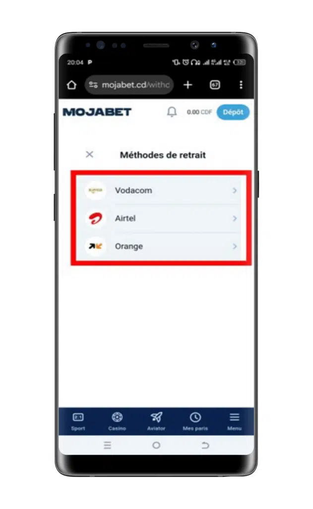mojabet Accéder à la section retrait et choisir la méthode de votre choix