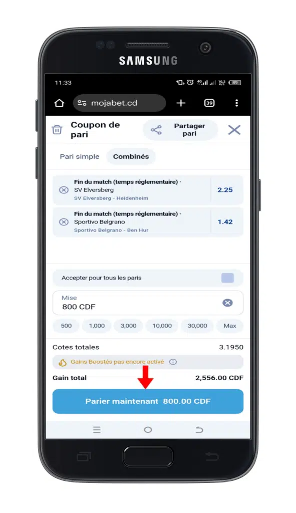 Saisissez le montant que vous désirez parier dans le champ dédié de votre coupon. Vérifiez attentivement votre gain potentiel affiché par le système, puis cliquez sur le bouton « Parier » pour confirmer définitivement votre mise et enregistrer votre ticket dans votre historique.