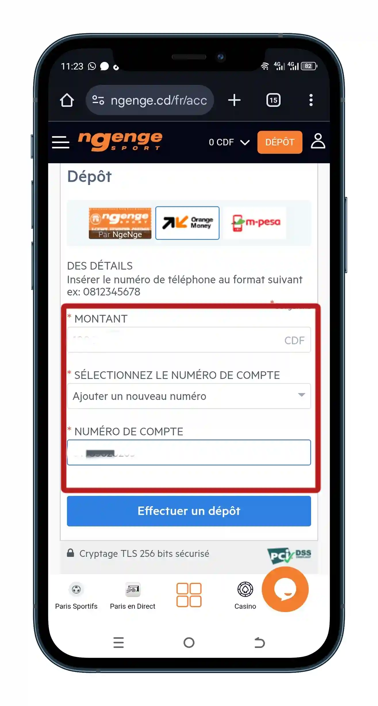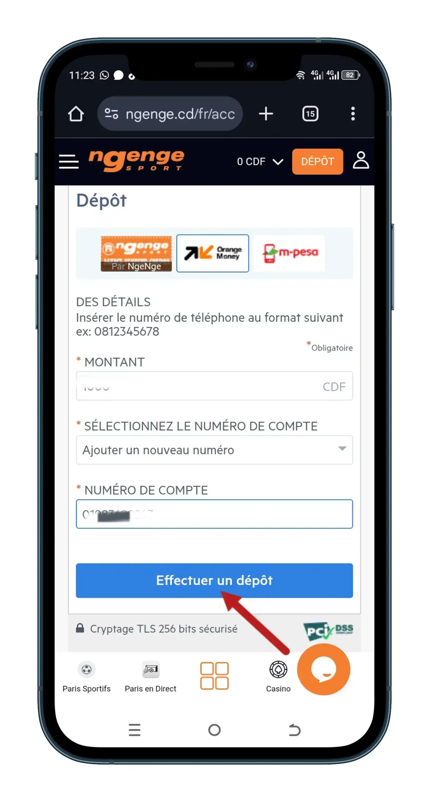 Saisissez le montant que vous souhaitez faire un dépôt sur NgeNge. Respectez le montant minimum dépôt NgeNge.