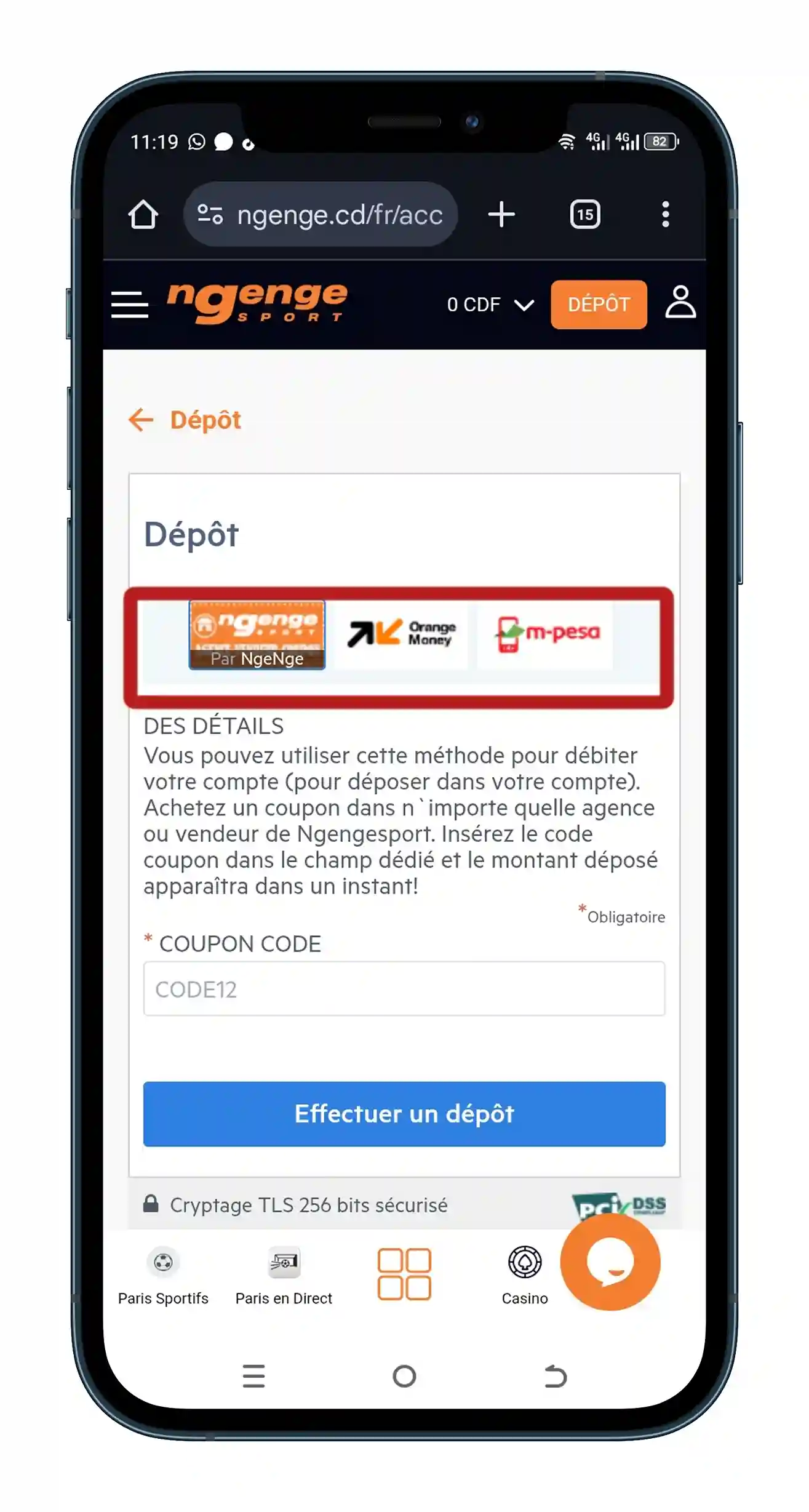 Vous recevez une notification sur votre téléphone mobile. Vous devez y saisir votre code secret pour autoriser la transaction. C’est le moyen le plus sûr de faire un dépôt sur NgeNge.
