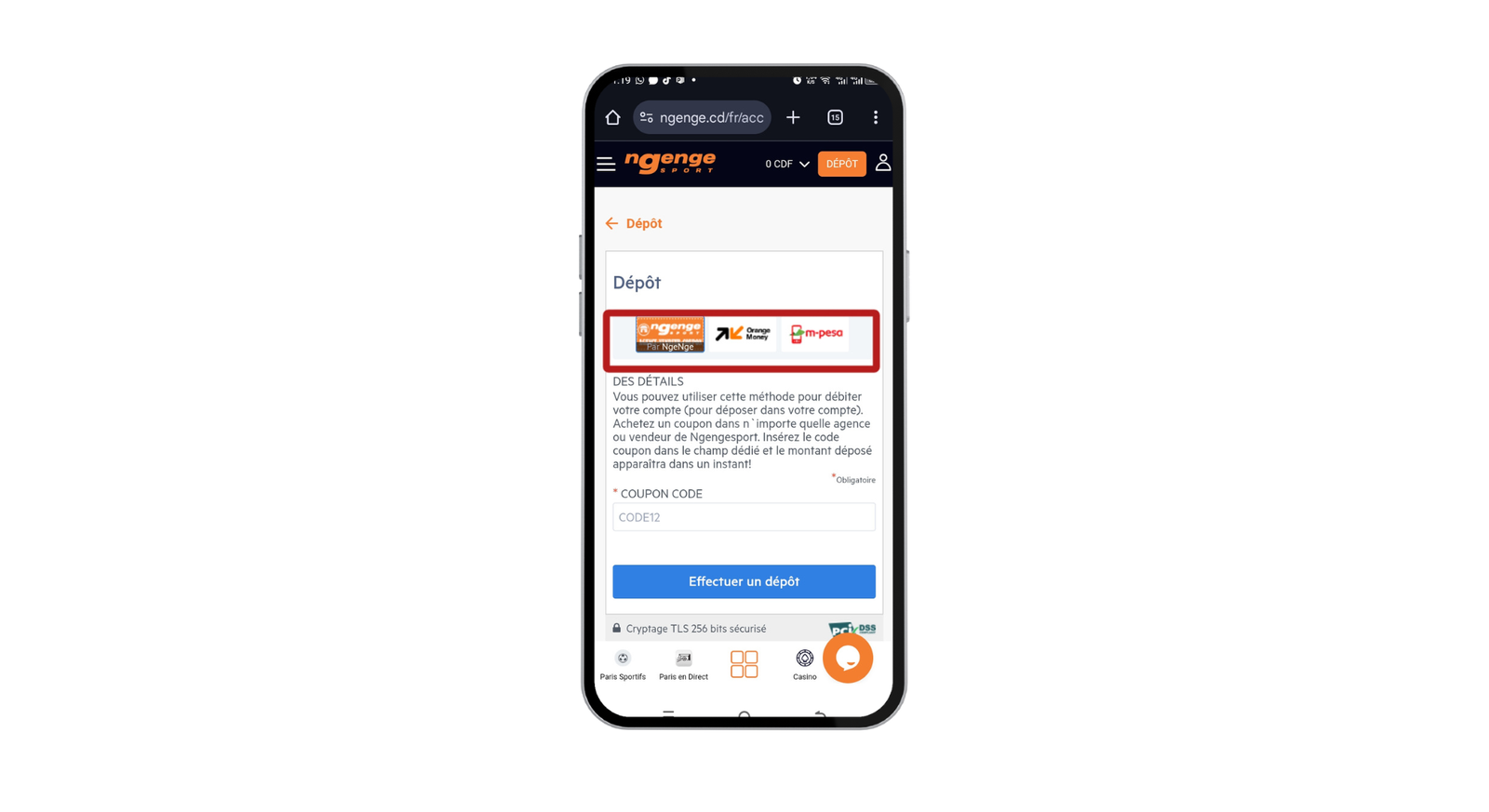 Choisissez votre option de paiement parmi : Orange Money, M-Pesa, Ngenge sport agence coupon