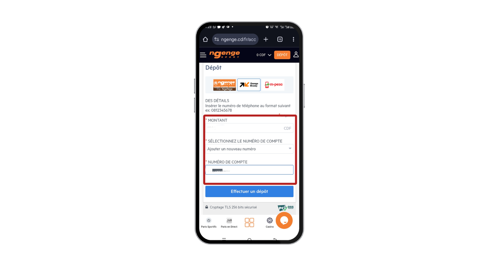 Saisissez le montant que vous souhaitez déposer. Le minimum est de 1000 CDF. Entrez votre numéro de compte Mobile Money (Orange Money ou M-Pesa).