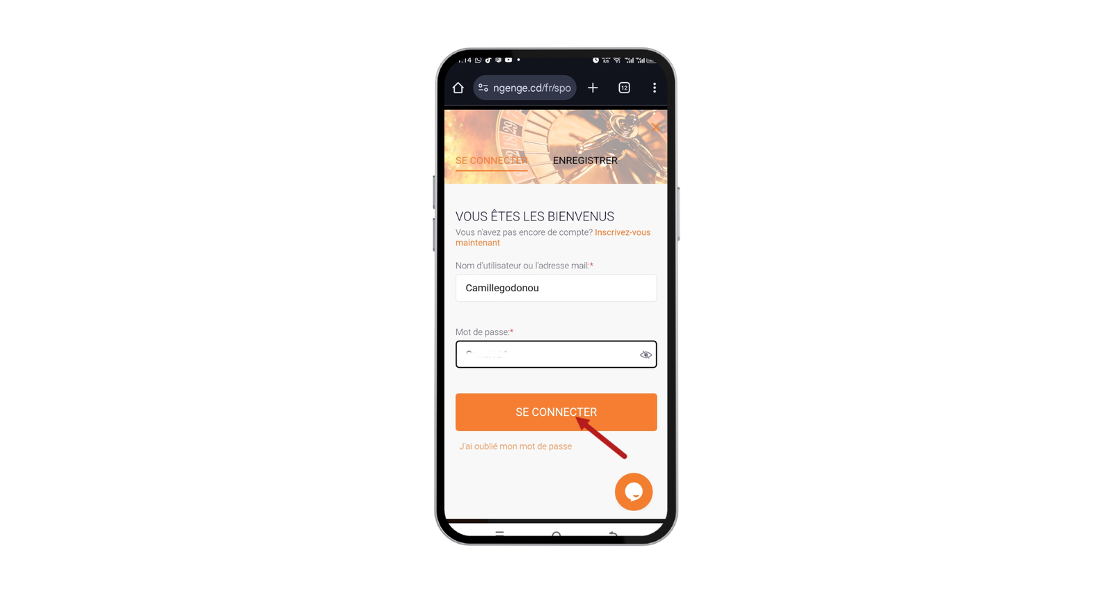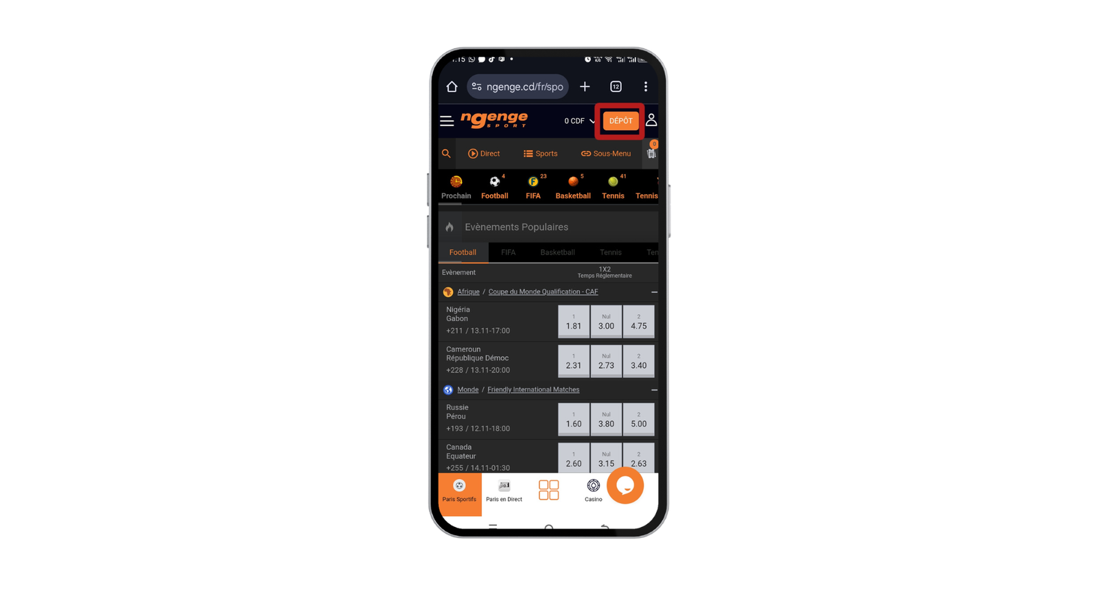 Rendez-vous sur le site et connectez-vous à votre compte ngenge sport à l’aide de vos identifiants. Cliquez sur le bouton « Dépôt » situé en haut de la page d’accueil.