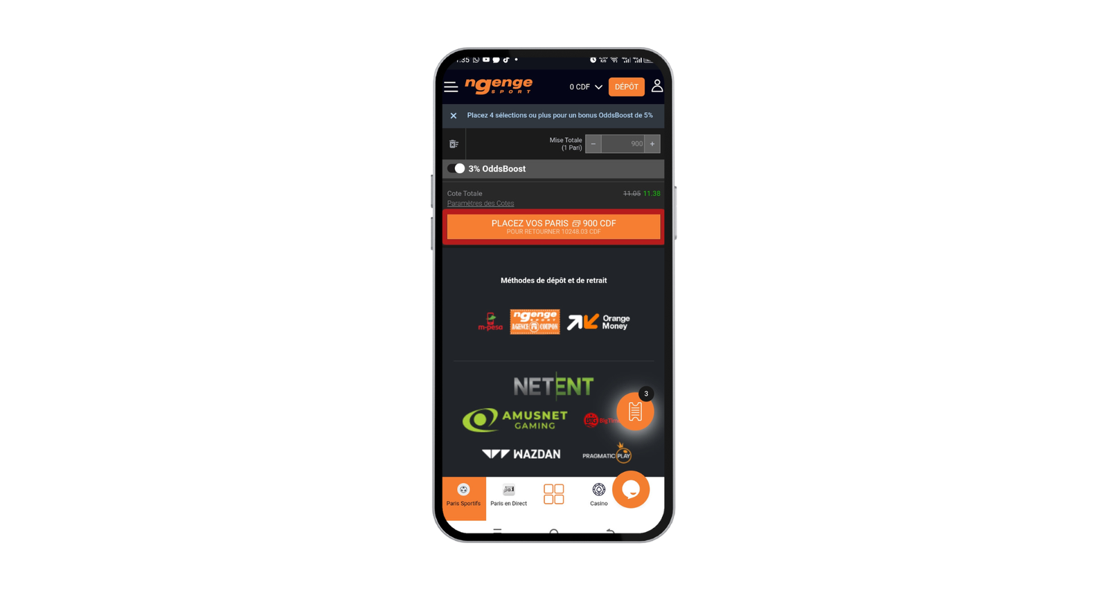 Accédez à la section « Dépôt » et choisissez votre méthode (M-Pesa, Orange Money, etc.). Déposez le montant souhaité (minimum 1000 CDF). Lors du dépôt, assurez-vous de sélectionner l’option « Choisissez un bonus » et d’opter pour le bonus de bienvenue. Le bonus de 75 % correspondant à votre premier dépôt (jusqu’à 150 000 FC) sera automatiquement crédité sur votre solde bonus une fois la transaction confirmée.