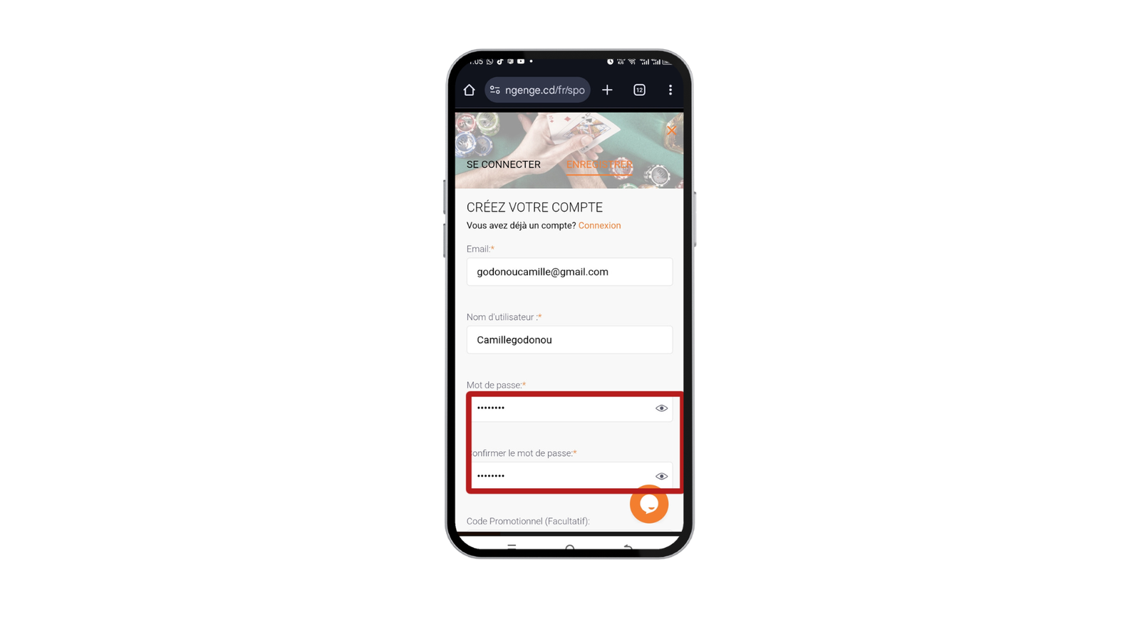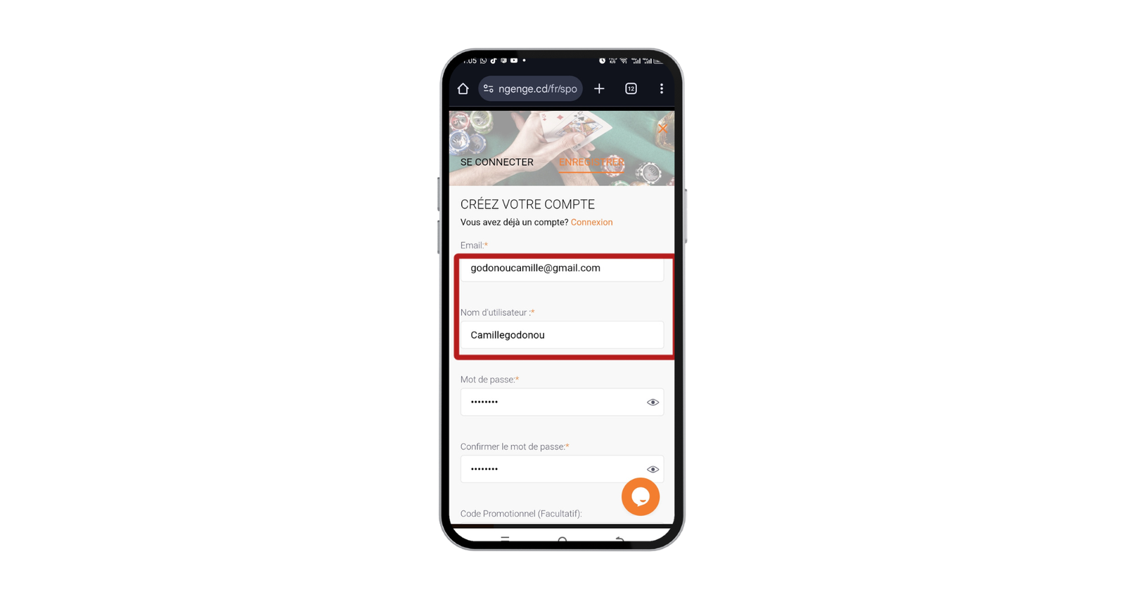 Rendez-vous sur le site officiel de ngenge sport et localisez le bouton « Registre » pour lancer le processus. Renseignez votre Email valide. Choisissez un Nom d’utilisateur et un Mot de passe fort, puis confirmez-le. Si vous n’avez pas de code spécifique, nous vous conseillons de laisser ce champ facultatif vide.