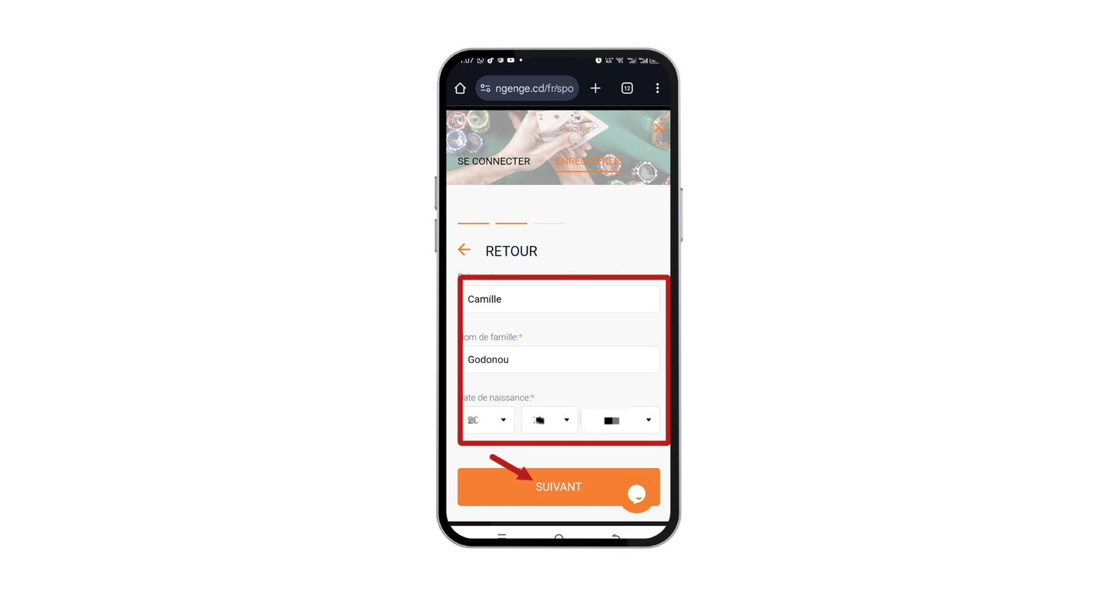 Le formulaire vous demandera ensuite vos informations d’identité pour des raisons de sécurité et de vérification. Entrez votre Prénom et votre Nom de famille exacts. Saisissez votre Date de naissance complète. Ces informations doivent correspondre à vos documents d’identité pour éviter des problèmes lors des retraits. Cliquez sur « Suivant ».