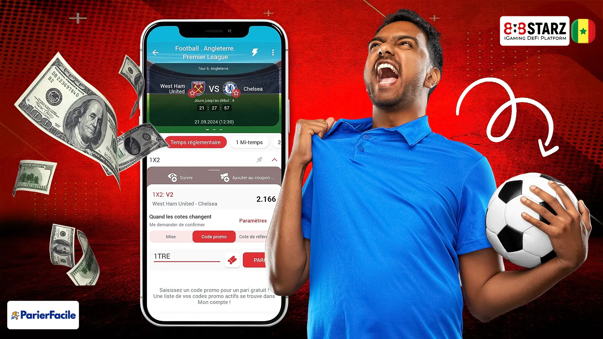Avec 888starz, les joueurs peuvent se servir d’un code promotionnel lors de leur inscription afin de doubler leur premier dépôt. Au Sénégal, le meilleur code promo pour 888starz est 1TRE. Il permet aux parieurs d’augmenter leur capital de départ sur le bookmaker et de bénéficier d’un remboursement partiel des pertes comptabilisées au casino ainsi que pour les paris sportifs.