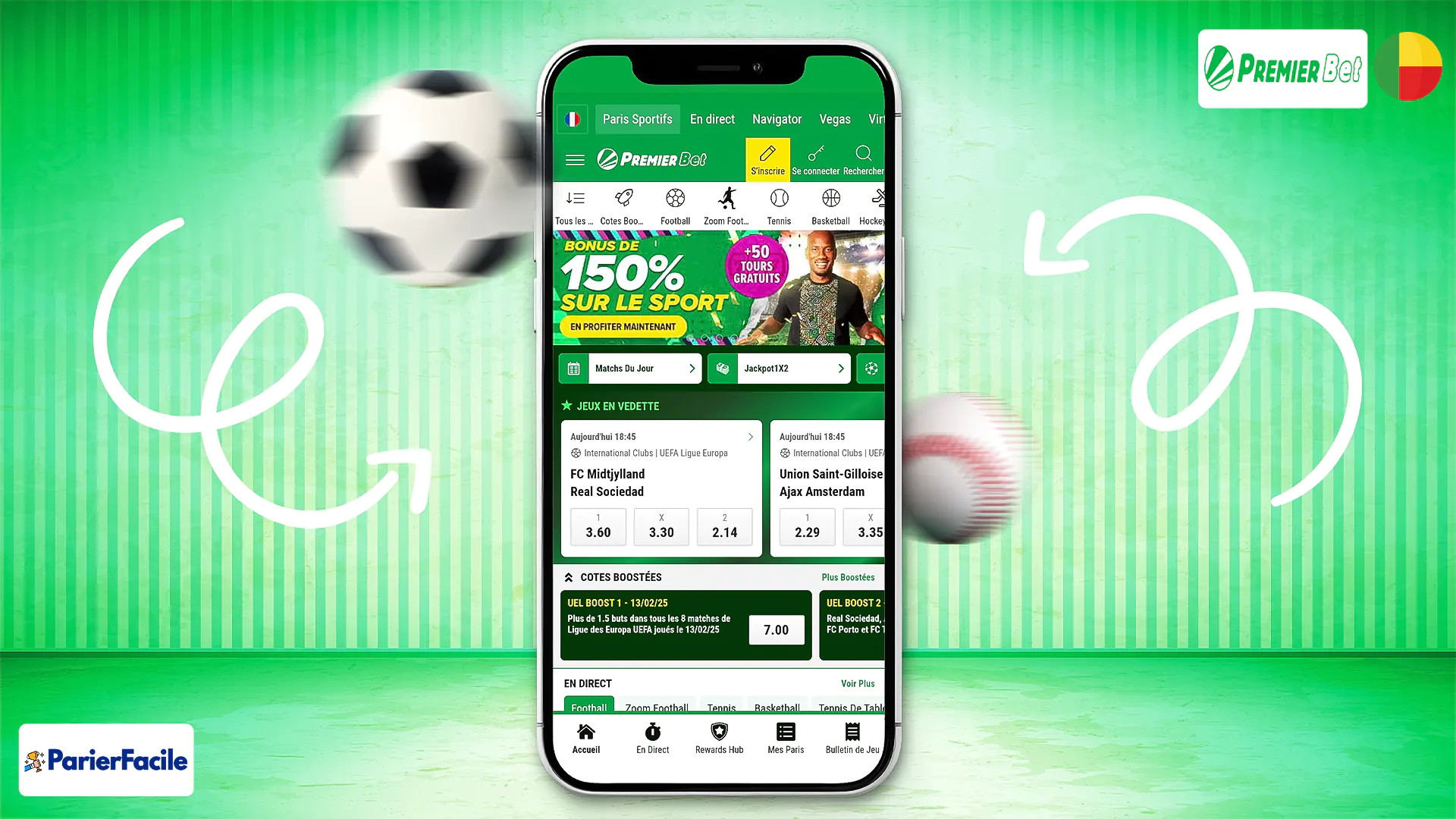 Rendez-vous sur le site officiel de Premier Bet Bénin via votre navigateur ou via l’application Premier Bet mobile et cliquez sur « S’inscrire ». Sur ce bookmaker, le bouton est visible en haut vers la droite.