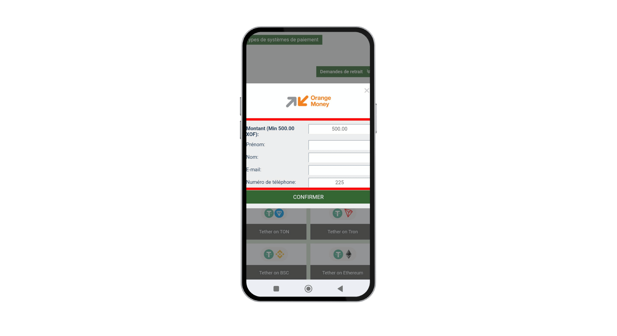 Étape 3 : Choisir Orange Money comme méthode de dépôt