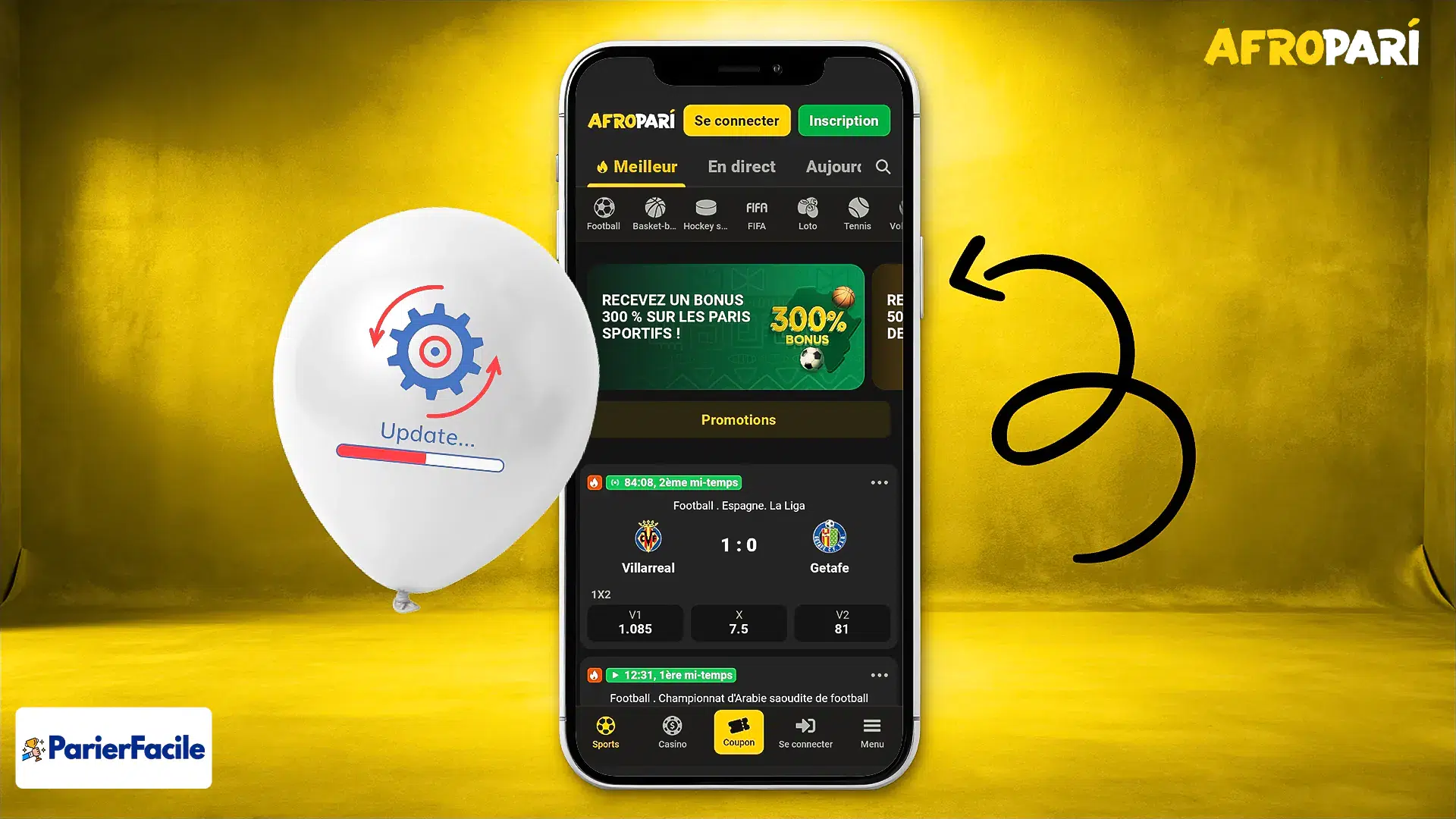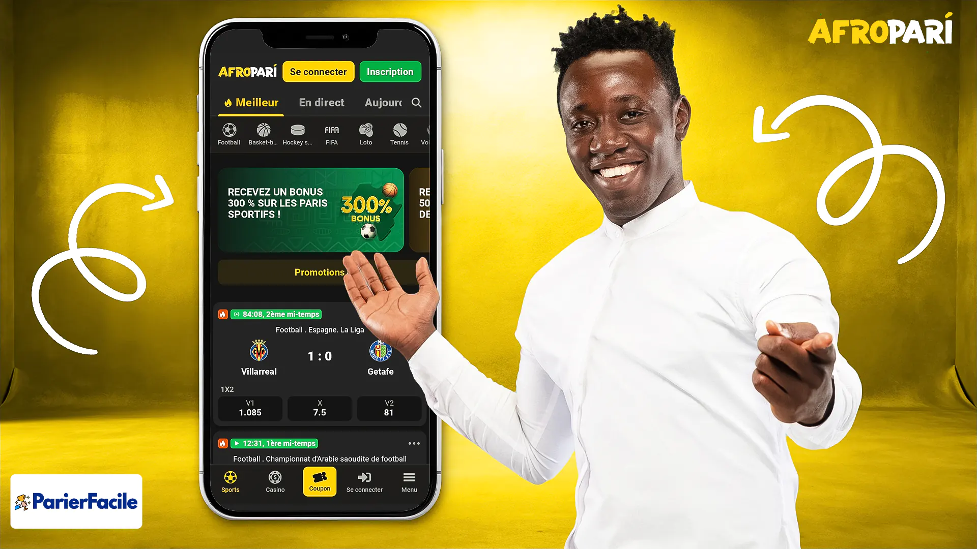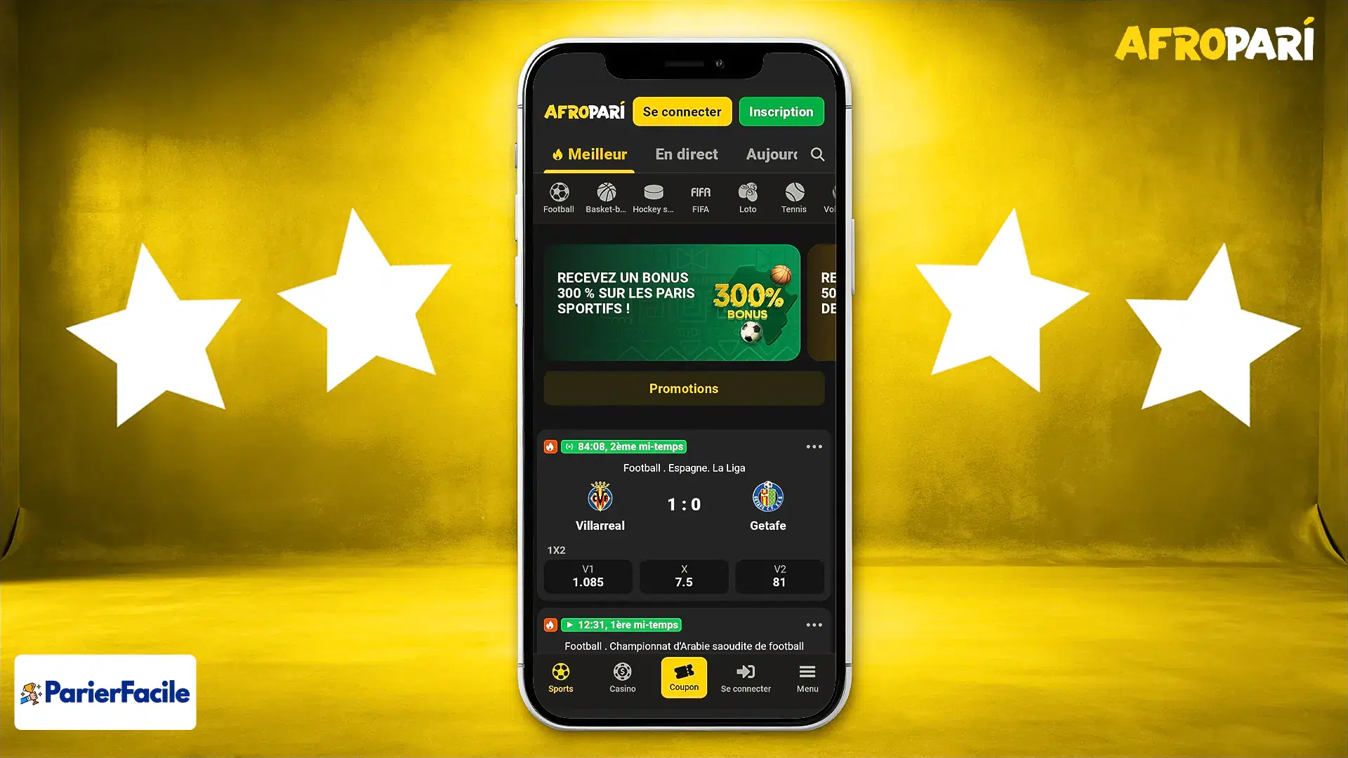 Le bonus de bienvenue d’Afropari pour les paris sportifs est de 300 % jusqu’à 130 000 XOF sur votre premier dépôt. Pour en profiter, suivez ces étapes :