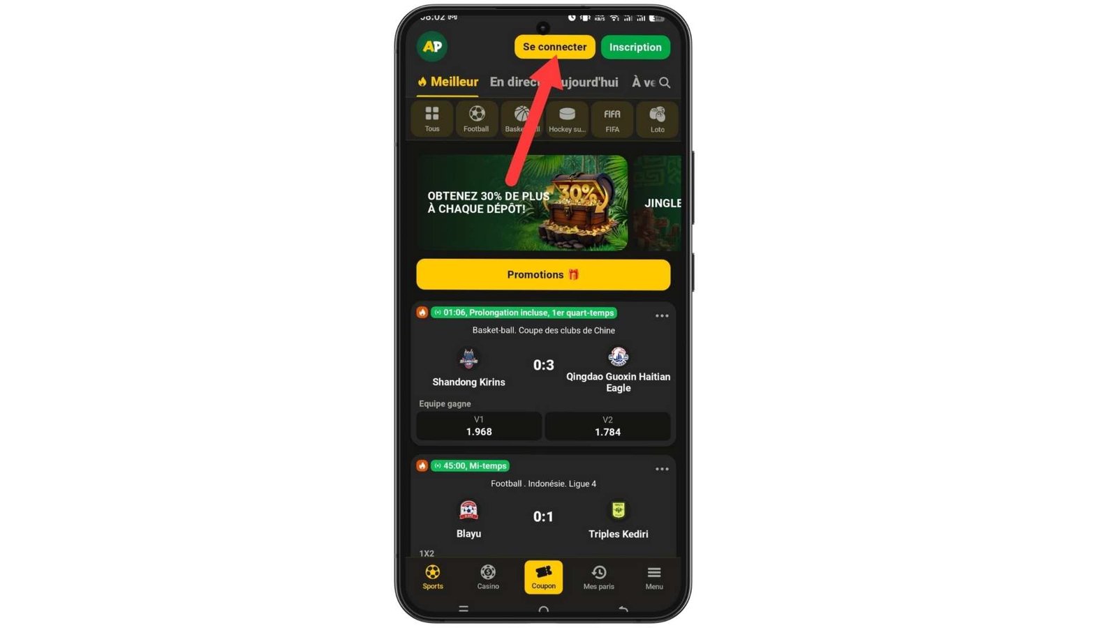 Accédez à l’application Afropari APK. Choisissez football, basketball, tennis ou e-sport.