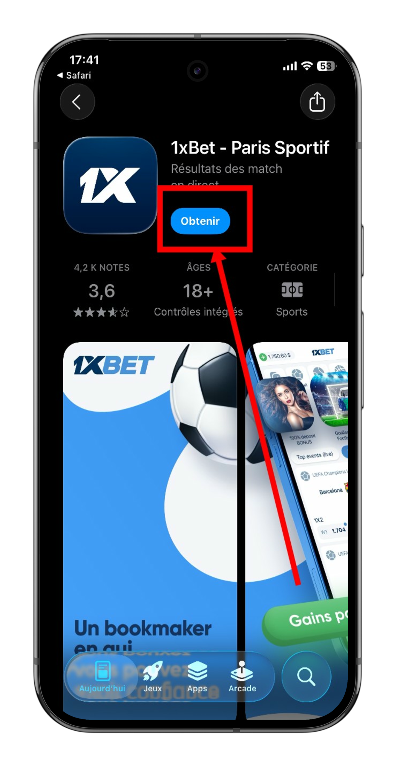 Retournez à présent sur la page d’accueil de l’App Store, puis dans la barre de recherche, lancez la requête « 1xbet ». Cliquez sur le bouton « Obtenir » pour télécharger et installer le fichier.