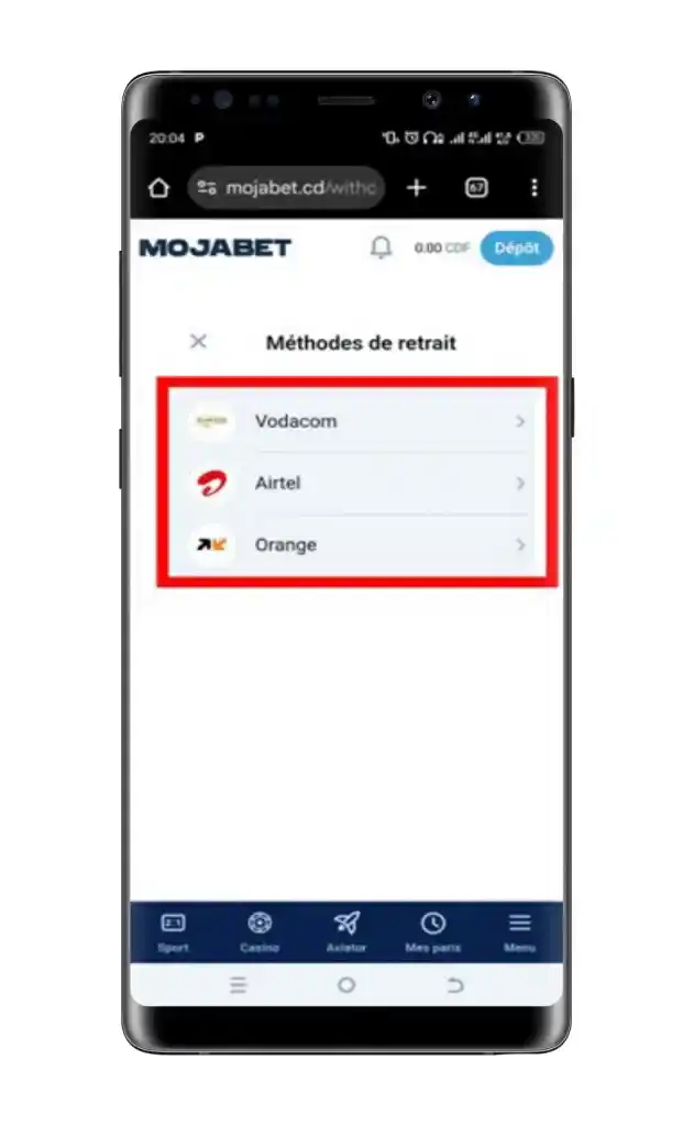 mojabet Accéder à la section retrait et choisir la méthode de votre choix